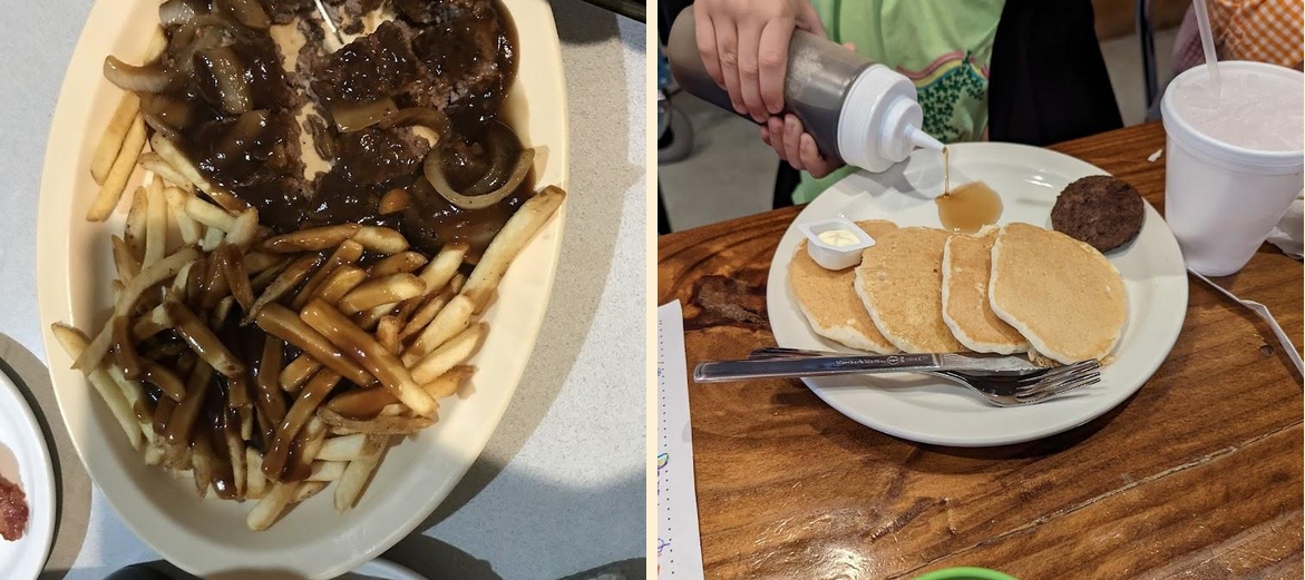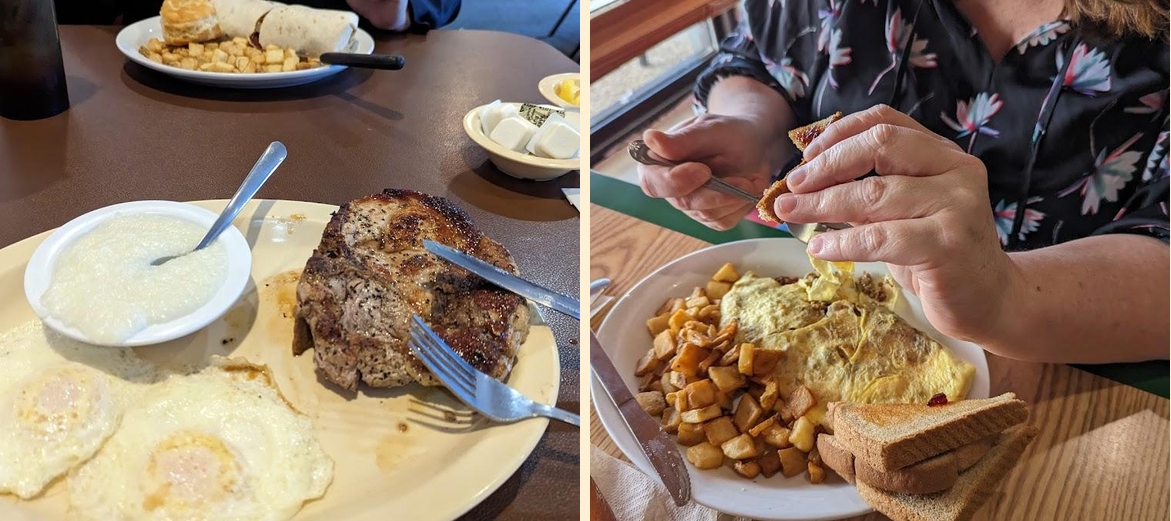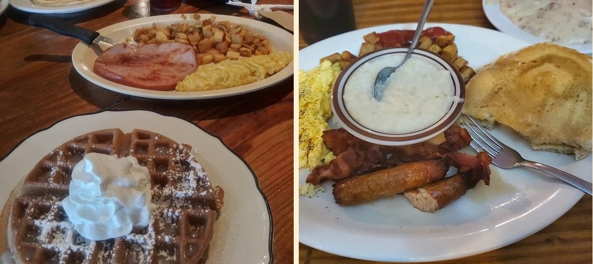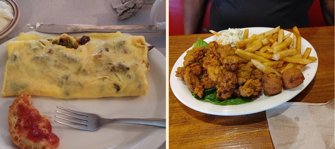 Eggheads Diner specializes in dishes like Chicken & Waffles, Ribeye Steak 'N Eggs, and Crabby Benedict. Each dish packs a local flavor.